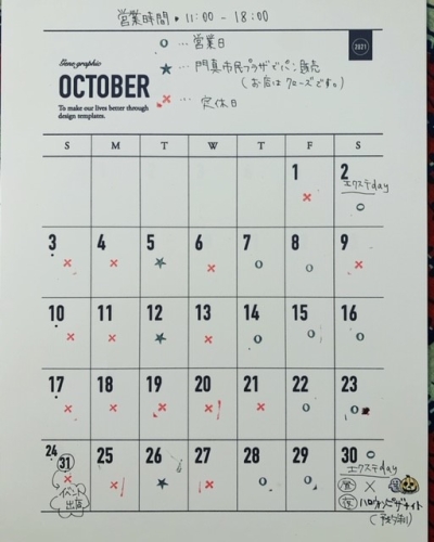 2021年10月の営業カレンダーを公開しています。